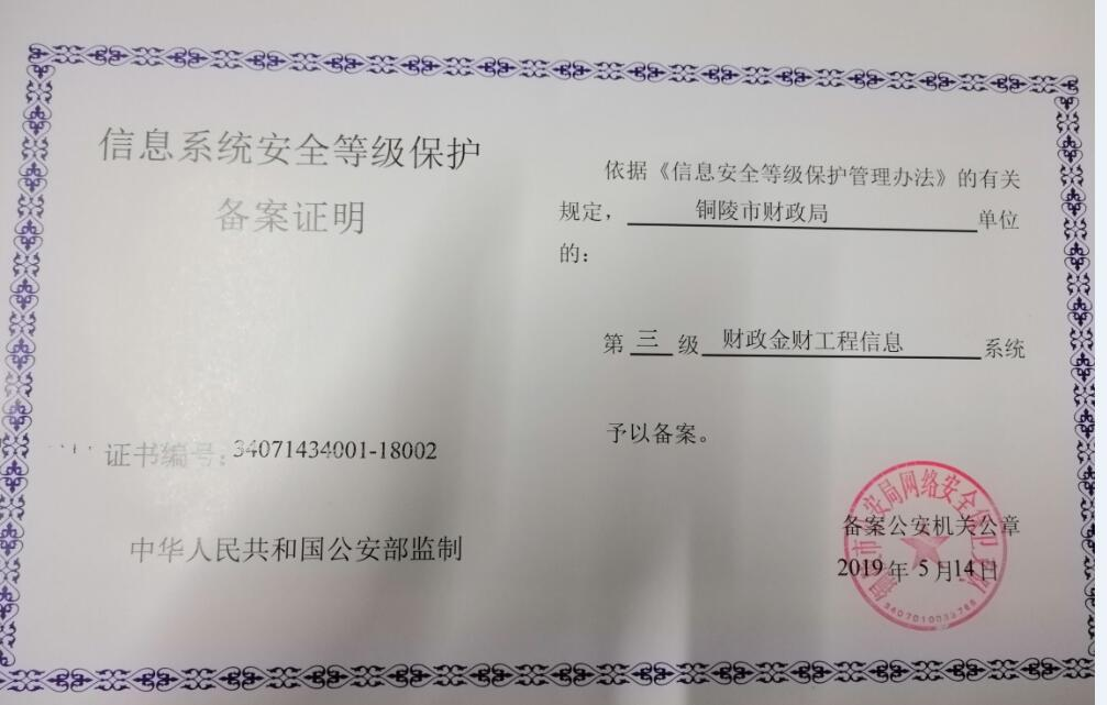 銅陵財政局順利通過信息系統(tǒng)安全等級保護(hù)評級備案